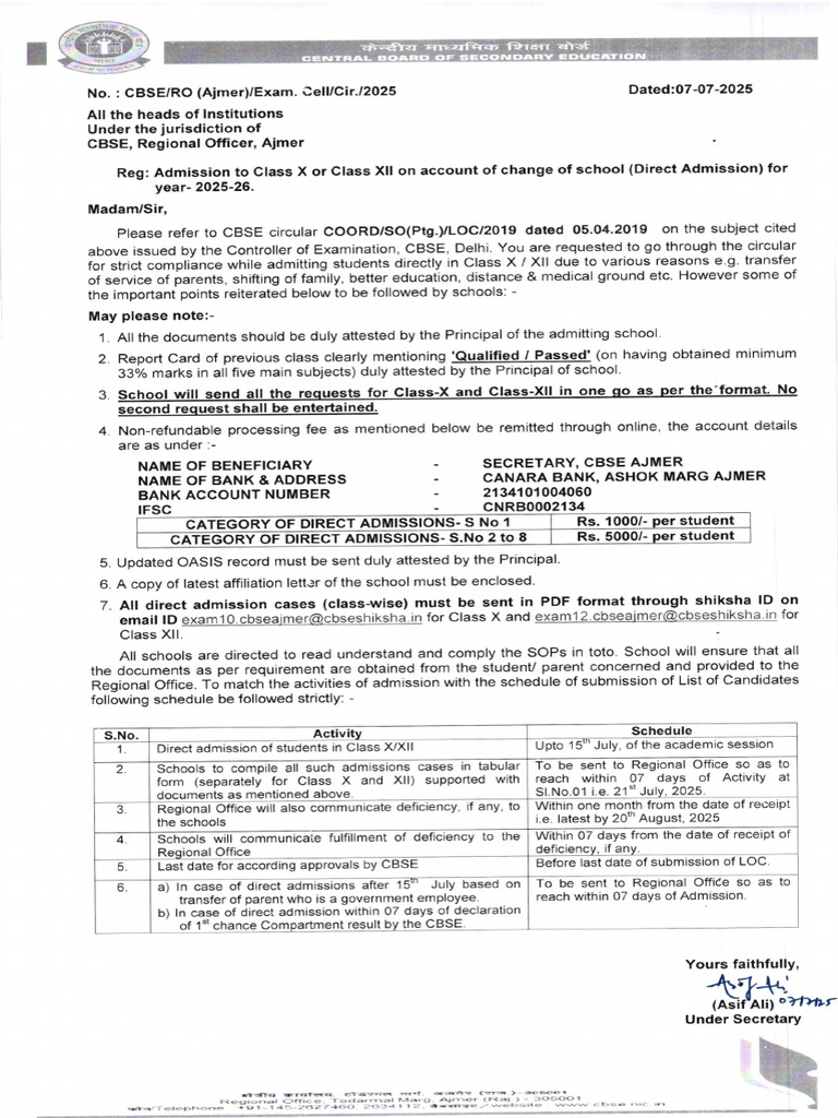 1 Direct admission of students in Class x/Xll Upto 15 July, of the academic session