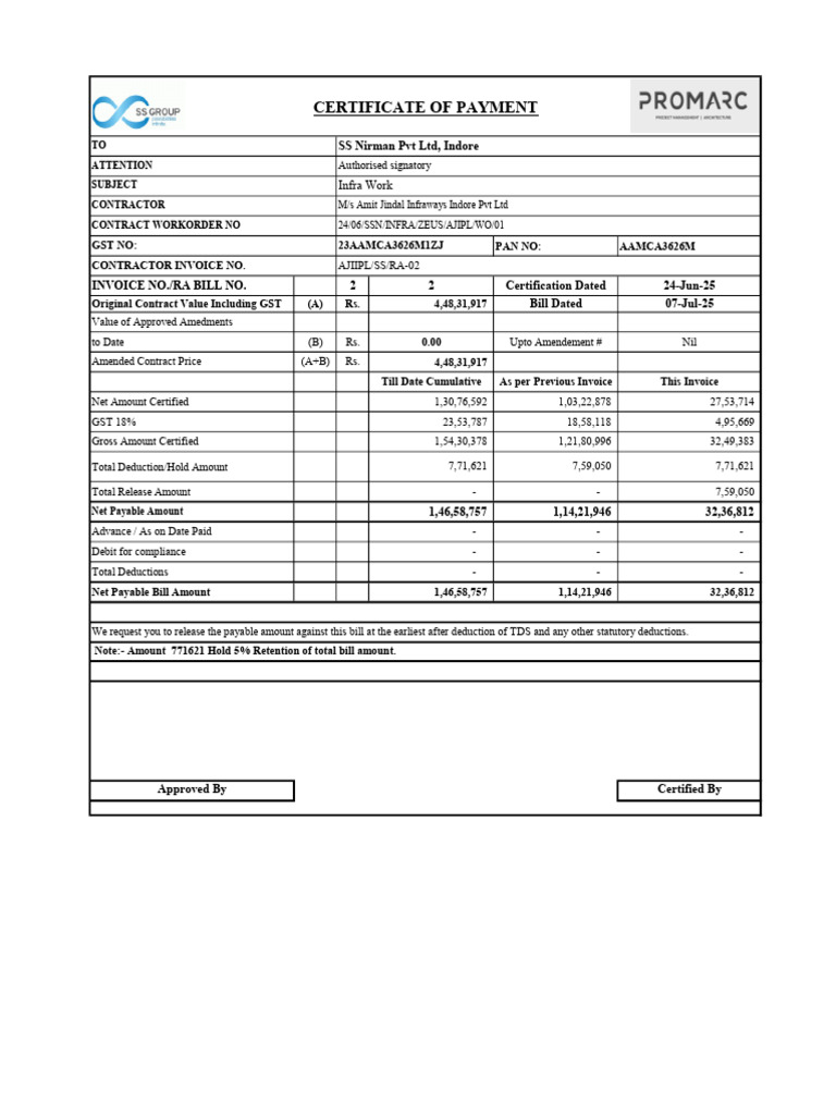 Note:- Amount 771621 Hold 5% Retention of total bill amount.