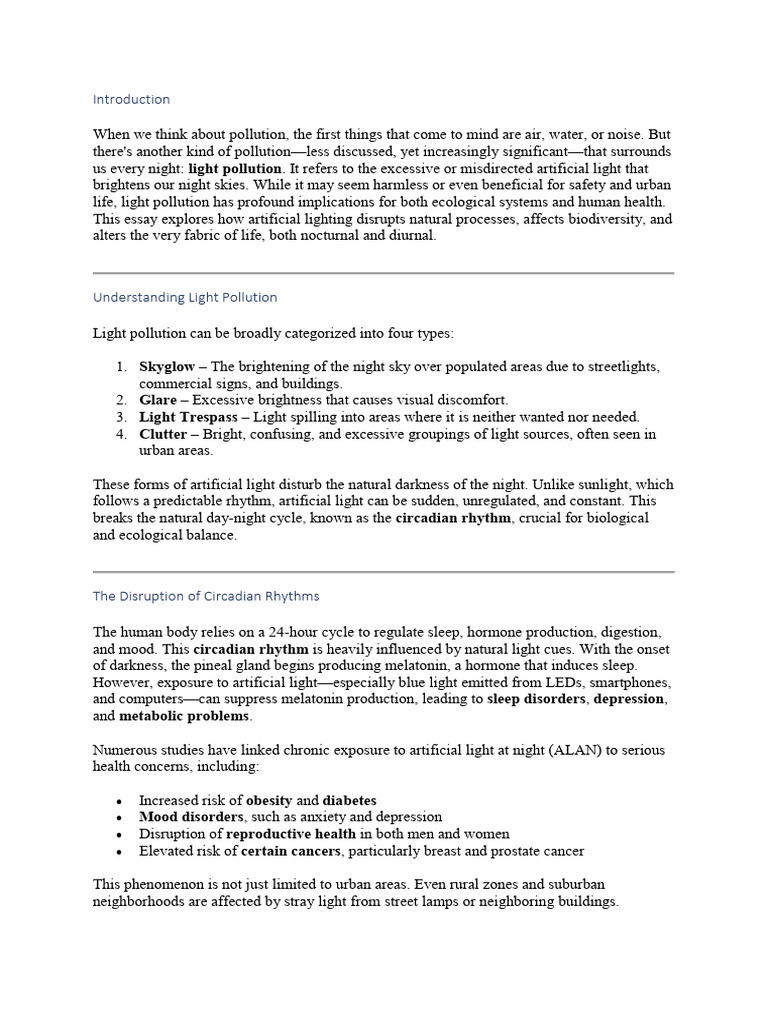 This essay explores how artificial lighting disrupts natural processes, affects biodiversity, and