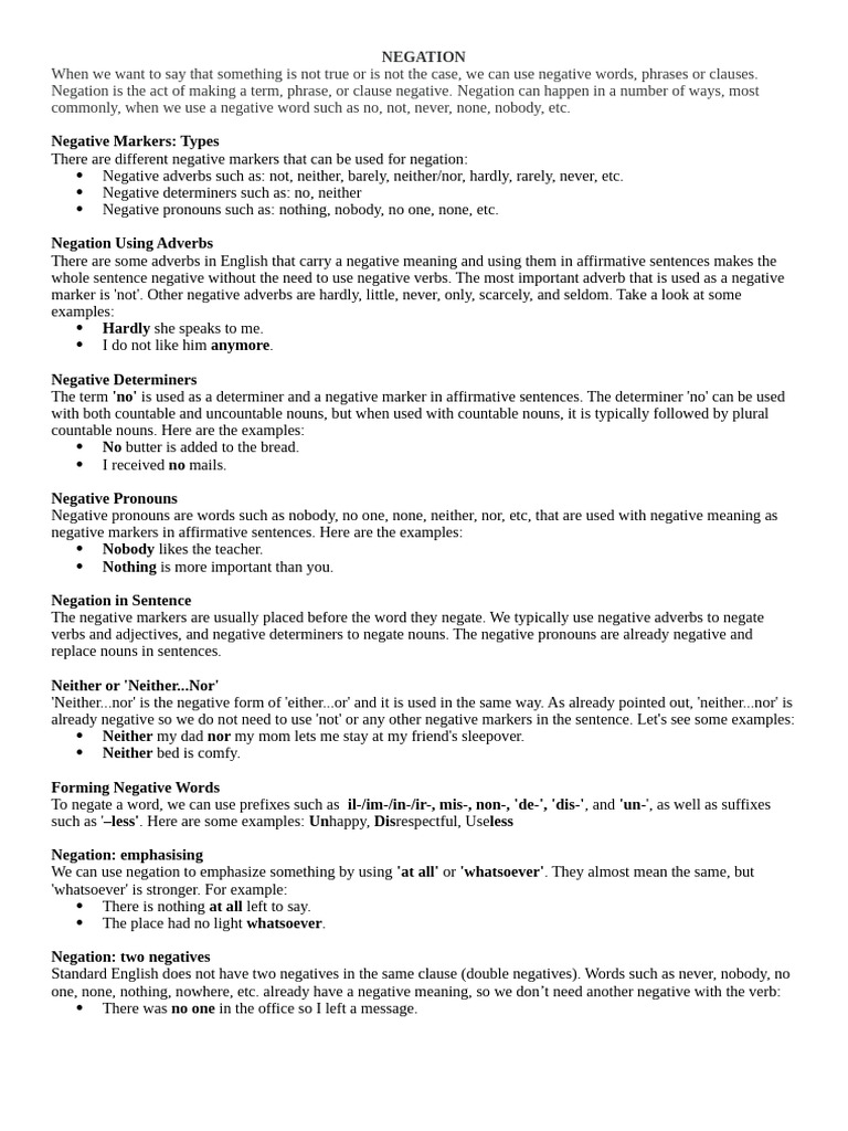 verbs and adjectives, and negative determiners to negate nouns. The negative pronouns are already negative and