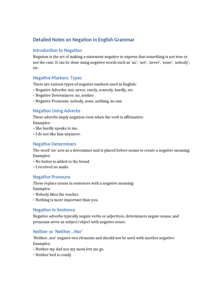 Detailed Notes on Negation in English Grammar
