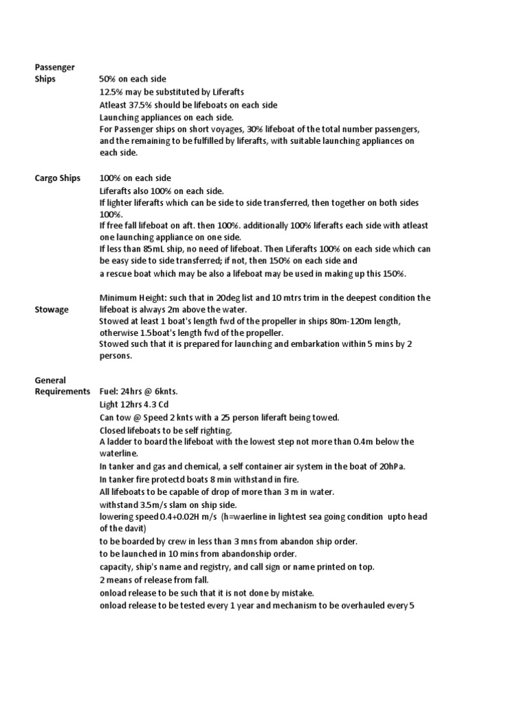 General Requirements Fuel: 24hrs @ 6knts. Light 12hrs 4.3 Cd Can tow @ Speed 2 knts with a 25 person liferaft being towed. Closed lifeboats to be self righting. A ladder to board the lifeboat with the lowest step not more than 0.4m below the waterline. In tanker and gas and chemical, a self container air system in the boat of 20hPa. In tanker fire protectd boats 8 min withstand in fire. All lifeboats to be capable of drop of more than 3 m in water. withstand 3.5m/s slam on ship side. lowering speed 0.4+0.02H m/s (h=waerline in lightest sea going condition upto head of the davit) to be boarded by crew in less than 3 mns from abandon ship order. to be launched in 10 mins from abandonship order. capacity, ship's name and registry, and call sign or name printed on top. 2 means of release from fall. onload release to be such that it is not done by mistake. onload release to be tested every 1 year and mechanism to be overhauled every 5