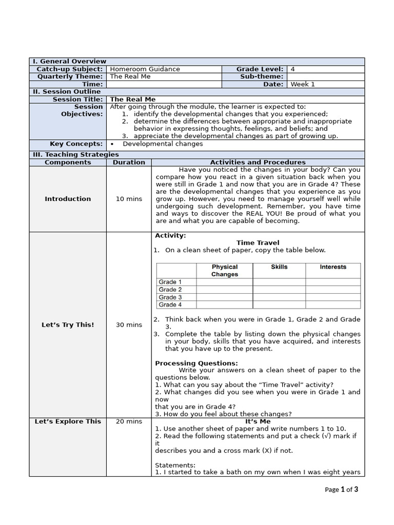 Catch-up Subject: Homeroom Guidance Grade Level: 4