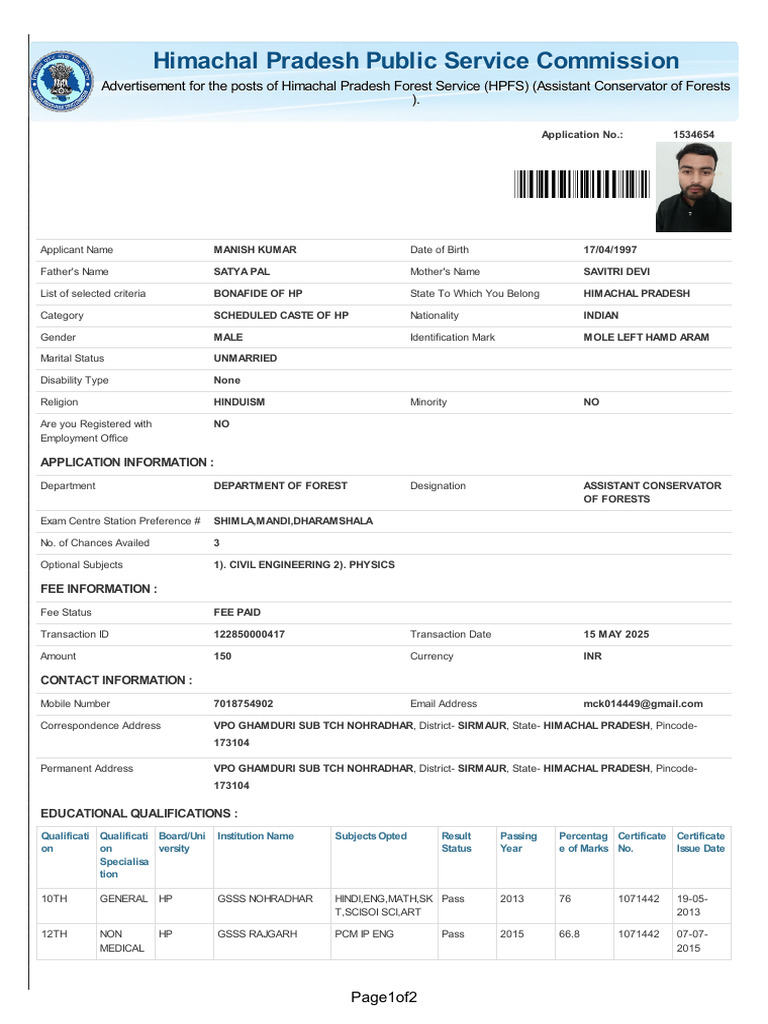 Category SCHEDULED CASTE OF HP Nationality INDIAN