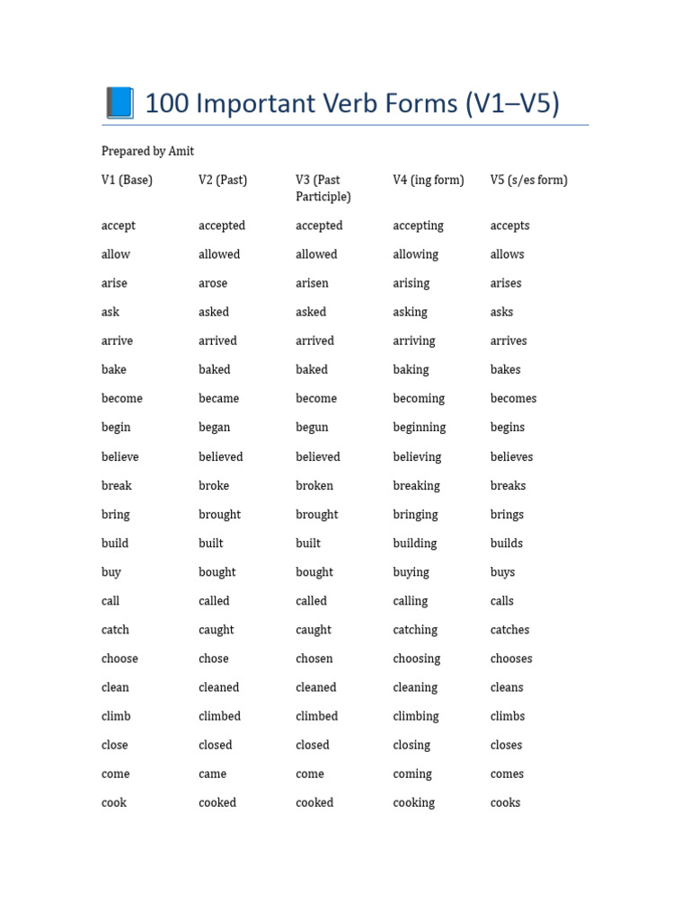📘 100 Important Verb Forms (V1–V5)