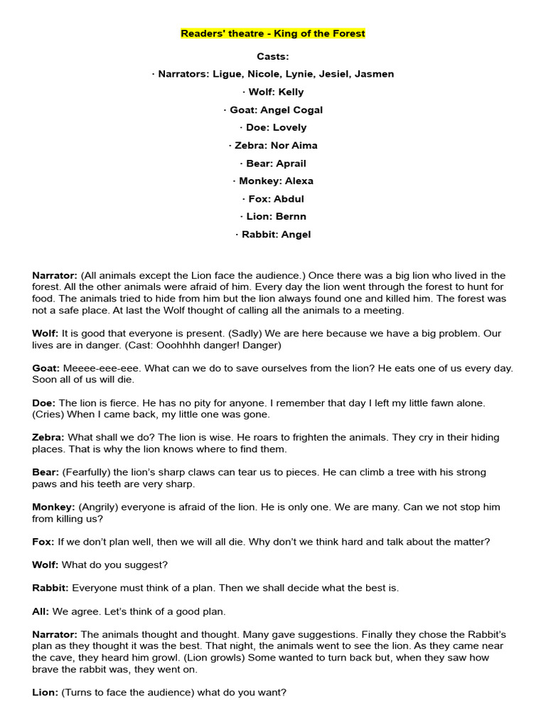 Lion: That is a good plan. Let’s try it. (All animals except the Lion turn their backs to the audience.)