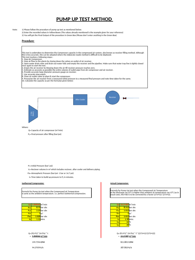 9. Pressurize the air receiver from a measured initial pressure to a measured final pressure and note time taken for the same.
