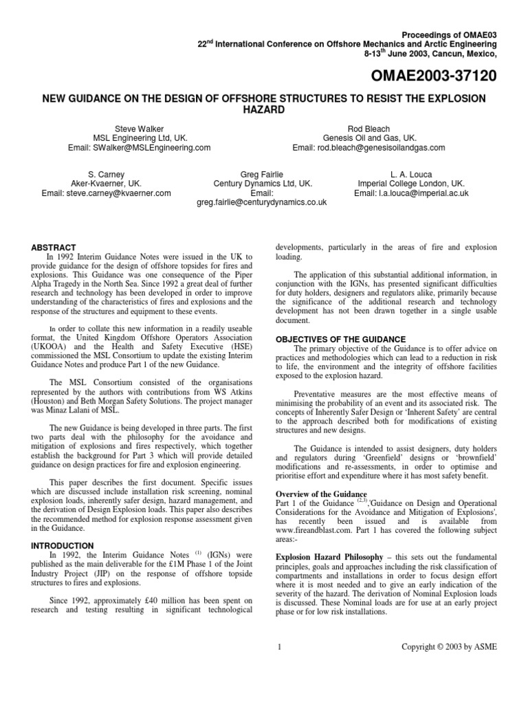 The MSL Consortium consisted of the organisations represented by the authors with contributions from WS Atkins (Houston) and Beth Morgan Safety Solutions. The project manager was Minaz Lalani of MSL. The new Guidance is being developed in three parts. The first two parts deal with the philosophy for the avoidance and mitigation of explosions and fires respectively, which together establish the background for Part 3 which will provide detailed guidance on design practices for fire and explosion engineering. This paper describes the first document. Specific issues which are discussed include installation risk screening, nominal explosion loads, inherently safer design, hazard management, and the derivation of Design Explosion loads. This paper also describes the recommended method for explosion response assessment given in the Guidance. INTRODUCTION In 1992, the Interim Guidance Notes (1) (IGNs) were published as the main deliverable for the 1M Phase 1 of the Joint Industry Project (JIP) on the response of offshore topside structures to fires and explosions. Since 1992, approximately 40 million has been spent on research and testing resulting in significant technological