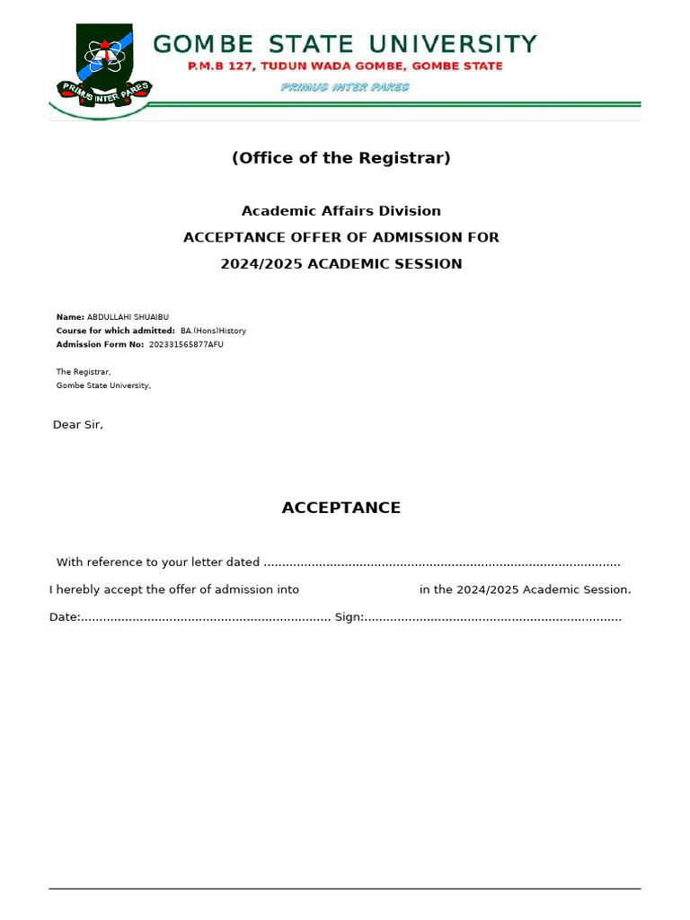 I herebly accept the offer of admission into BA.(Hons)History in the 2024/2025 Academic Session.