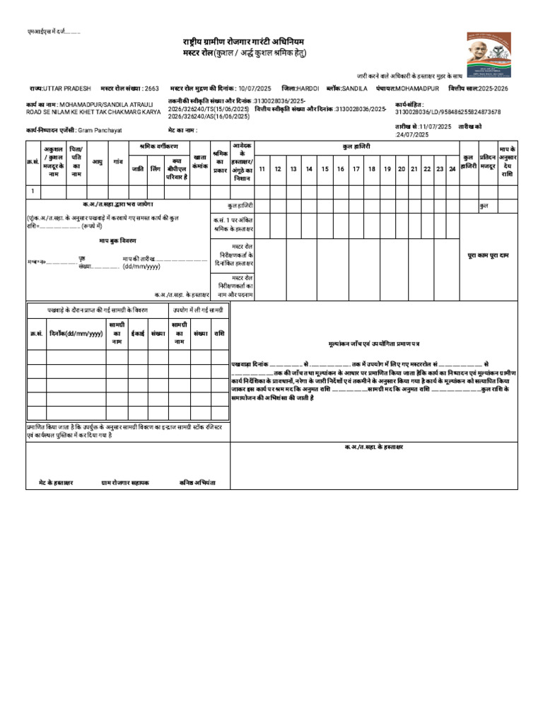 राज्य:UTTAR PRADESH मस्टर रोल संख्या : 2663 मस्टर रोल मुद्रण की दिनांक : 10/07/2025 जिला:HARDOI ब्लॉक:SANDILA पंचायत:MOHAMADPUR वित्तीय साल:2025-2026