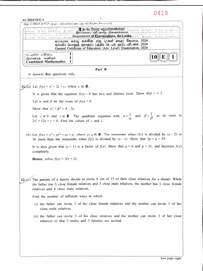 General Certificate of Education (Adv. Level) Examination, 2024