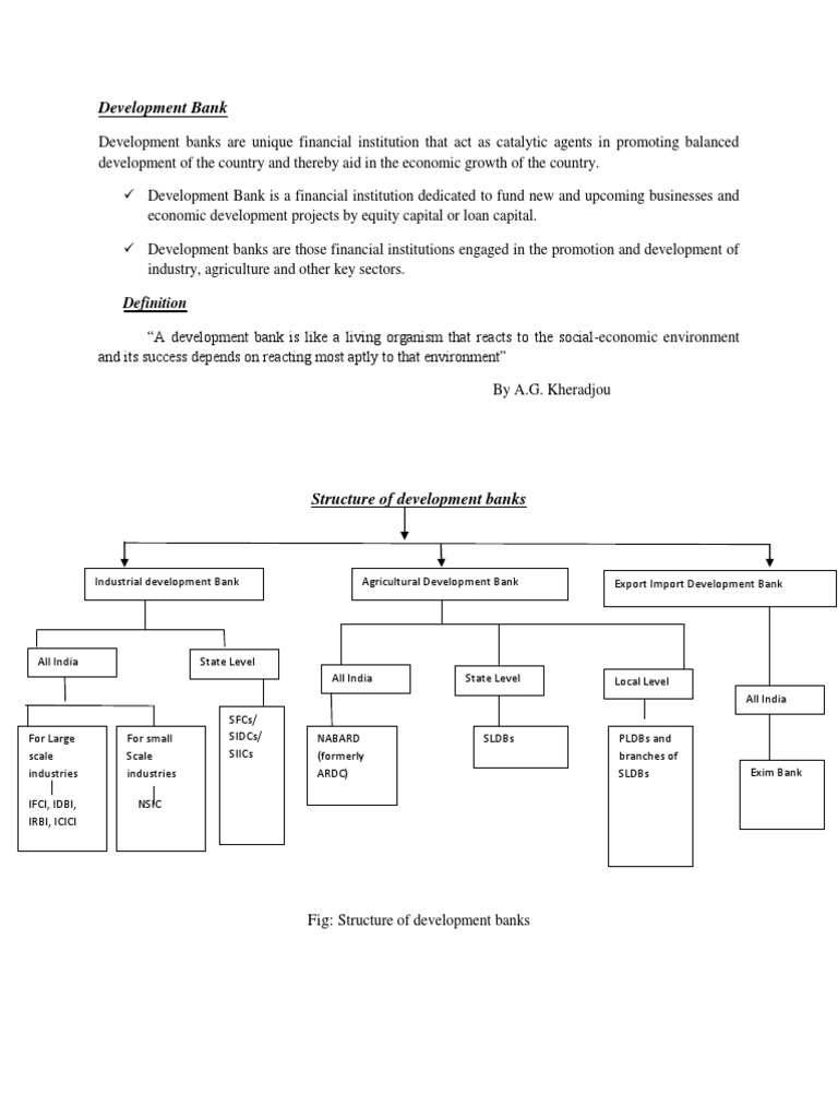 Development banks are unique financial institution that act as catalytic agents in promoting balanced development of the country and thereby aid in the economic growth of the country. Development Bank is a financial institution dedicated to fund new and upcoming businesses and economic development projects by equity capital or loan capital. Development banks are those financial institutions engaged in the promotion and development of industry, agriculture and other key sectors. Definition A development bank is like a living organism that reacts to the social-economic environment and its success depends on reacting most aptly to that environment By A.G. Kheradjou