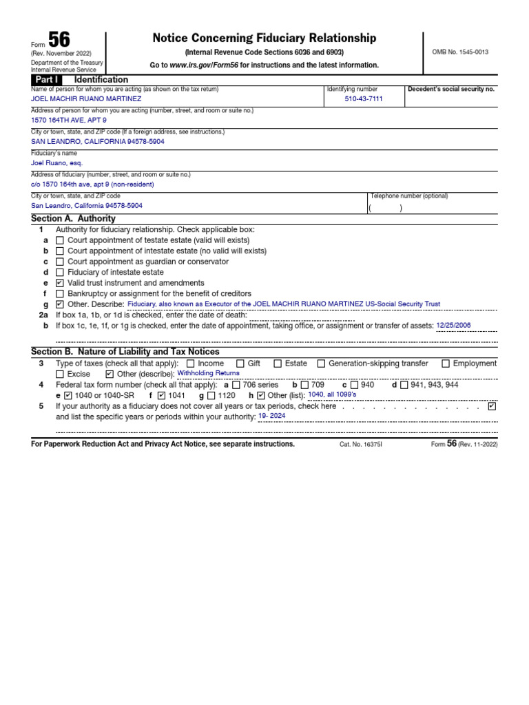 For Paperwork Reduction Act and Privacy Act Notice, see separate instructions. Cat. No. 16375I Form 56 (Rev. 11-2022)