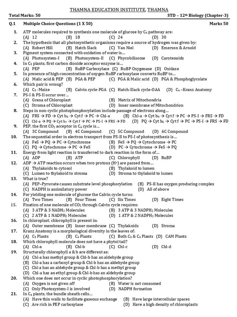 Total Marks: 50 STD – 12th Biology (Chapter-3)