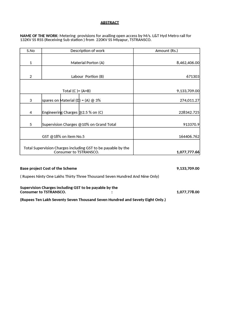 NAME OF THE WORK: Metering provisions for availing open access by M/s. L&T Hyd Metro rail for