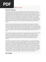 Even cash- and resource-rich companies are constrained by rising health care costs. According to a study of medical cost trends by PricewaterhouseCoopers for 2007, increases in health spending have become a continuing source of pressures on business results and a frequent source of debate and fingerpointing. Employers only hope is to slow them down.4 In their survey, Health & Wellness Programmes are seen by employers as useful investment in deflating health care costs. The Dallas Chamber Report (2006) provides evidence of benefits of corporate investment in preventive health care: Employee wellness programmes can increase productivity and lower healthcare costs. In the past 10 years, the annual return on investment for employeewellness programmes has been about $6 saved for every $1 spent. Welldesigned worksite-wellness programmes create a 25 per cent reduction in health-plan costs, sick leave, disability pay, and workers compensation.5 Objectives of the Study The objectives of this study are to: Examine the empirical evidence on relationship between preventive health care and labour productivity and corporate profitability; Generate awareness on the role of preventive health care in boosting the corporate sectors performance and improving the countrys economy; Offer recommendations, on the basis of our findings, for policymakers and the corporate management to promote employee wellness programmes. Preventive Health care in Indias Corporate Sector The primary research undertaken for this study included an electronic survey of some of the most well-established companies in the country, as well as a fieldcum-electronic survey with a sample of employees in Delhi and the National Capital Region.