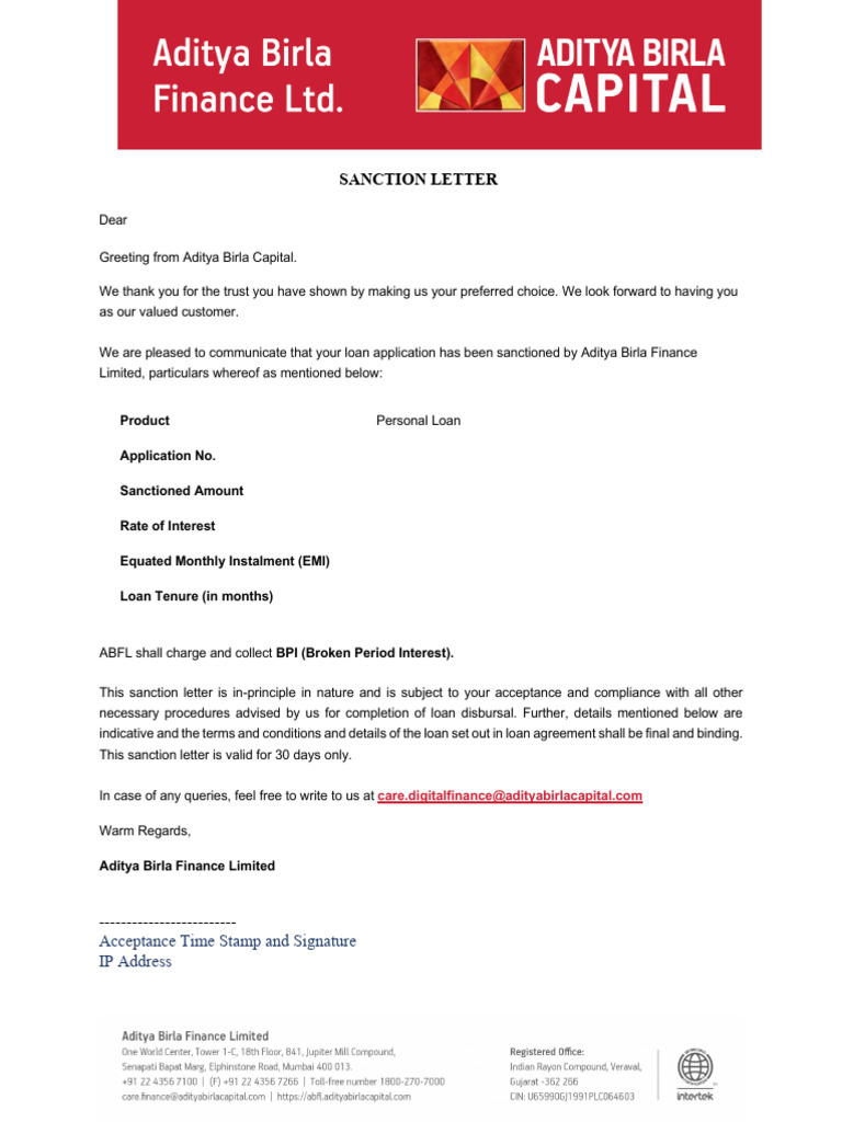 We are pleased to communicate that your loan application has been sanctioned by Aditya Birla Finance