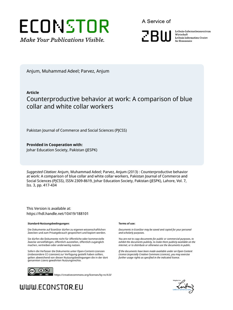 Suggested Citation: Anjum, Muhammad Adeel; Parvez, Anjum (2013) : Counterproductive behavior