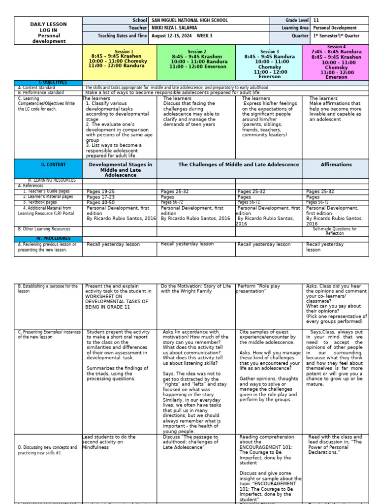 II. CONTENT Developmental Stages in The Challenges of Middle and Late Adolescence Affirmations