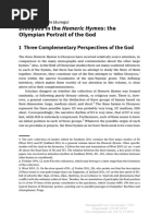 18 narratives designed to capture precisely those powers through words. By reminding a god through hymnic worship of his mighty and benecent deeds in the past, the worshipper wishes both to dene the deity addressed and his powers, and to secure a measure of that power for himself through divine grace.19 Whilst the whole myth and ritual school of interpretation has worked on the premiss that there is an intrinsic connection between the two modes the ritual and the mythical it has not been adequately grasped just how close the link in fact was: the myths formed the substance of hymns sung before or during the ritual.20 Conversely, narrative acquires a new and enhanced dimension when it is realized that it was not intended solely for human recipients, but primarily for the ears of the deity about whom it narrates. The Python myth in Apolline cult, for example, is not only narrative of an exciting kind, it also features in numerous hymns to Apollo which seek to emphasize his might, and to petition for help in a current situation. By narrating the deeds of the gods, the Homeric Hymns dene the characters and areas of power of these gods (see Clay, 1989). These denitions then become the basis and legitimation of cult. Thus the narrative becomes a kind of charter for the gods claim to worship of a certain kind, and conversely the basis for the worshippers expectation of help. In practical terms, the student of ancient religion must, in our opinion, pay close attention to any surviving hymnic texts relating to a cult concerned, and, in their absence, consider notices relating to their possible content. Later scholarship in antiquity is frequently helpful here: in one instance, a late author, Himerios, relates in prose the entire content of an original (lost) hymn to Apollo by Alkaios (no. 2.1).