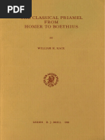 the rituals our city always performed in your honour.173 In these cases the reminder serves to persuade the gods to save the community; an interesting example of a hymn reminding a god of services rendered by private persons is found in the hymn composed by Nikiades for Nikias and his wife (no. 12.5). Then again the poet may feel that the god will be most pleased by a narrative, di g sis. For the content of this narrative a poet has various e e choices. He may tell the story of the gods birth, as Isyllos does in his paian to Asklepios; the Epidaurians, too, will have been satised to hear that their god is autochthonous and not imported from elsewhere. Sometimes the poet combines the narrative of the birth of a god with a specic benet conferred by him on mankind, e.g. in HHHermes the gods invention of the lyre, in Pindar P 3.47-53 Asklepios healing arts. Or he can relate in epic manner the prowess of the god in combating monsters, e.g. Athenas part in the Gigantomachy, a theme which must have been celebrated in many an Athenian hymn, or Apollos slaying of the Python, as in the two Delphic paians with musical notation. In other cases the poet presents the story of the gods epiphany, as at the end of HHDemeter and Isyllos paian to Asklepios;174 or he may just give an elaborate account of the gods central activity.175 In the late Hellenistic and Roman era a new genre of texts developed from this hymnic convention of presenting, as part of a hymn, a narration of the gods (mainly mythical) great and benecial deed: these often included miracles (especially miraculous healings) wrought by the god. Modern scholarship has coined the term aretalogy for this type of texts (see above p. 48f.). We may summarize the possible elements of the praise part of a hymn as follows: predication of powers through relative clauses or participles repeated (anaphoric) addresses