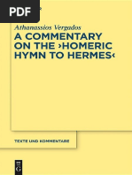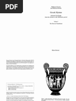 At an early stage it bore the general sense of song, though possibly with connotations of praise or celebration.25 The more specic meaning song of praise for a god developed from that, and is current in the classical period. Plato, for example, draws a clear distinction between hymns ) for men (Rep. ( ) as songs in praise of gods, and encomia ( 26 An ancient denition of hymnos used in this religious sense 10.607a). runs hymnos is discourse in the form of adoration, with prayer conjoined with praise, addressed to a god.27 The denition contains a number of essential points: the hymn worships ( ) gods with combined prayer ( ) and praise ( ). We may compare this with another ancient denition given by Dionysios Thrax (2nd c. BC): the hymn is 28 a poem comprising praises of the gods and heroes with thanksgiving. This formulation species that a hymn has poetic form ( ), includes heroes among recipients of hymnic worship,29 and uses the expression eucharistia, thanksgiving to denote an essential element of the worshippers offering of song. In a way the more general ancient term for the collective singing of a deitys praise by a group denoted the whole activity (song, dance, place of worship): choros, the chorus which learnt the dance steps, the words and the melody which in combination constituted the hymns performance. To set up a chorus ( ) for the performance of ritual songs be30 came the standard term for the inauguration of hymns in performance. Numerous passages describe the founding of the cult of a god or hero, either in conjunction with the erection of an altar and/or temple in his/her honour or with reorganization of the cult. For example, at Bacchylides 11.108ff., when Artemis persuaded Hera to reprieve the daughters of Proitos from their god-sent madness, they built her an altar and temenos and inSee the PW article Hymnos by W nsch, 141-2. u Cf. Etym. Gud. 540.42 Sturz. 27 Etym. Gud. . 28 451.6 Hilgard: . 29 In this collection we do not include hymns to heroes, limiting ourselves to those addressed to recognized divinities. For an interesting early hymn to the hero Achilles see Simonides fr. 10-11 West2 ; cf. L. Sbardella, Achille e gli eroi di Platea. Simonide frr. 1011 W2 , ZPE 129, 2000, 1-11. 30 LSJ s.v. iii 4; cf. Aristoph. Clouds 271 with Dovers note, and Birds 219 with Dunbars note; Burkert (1977, 168).