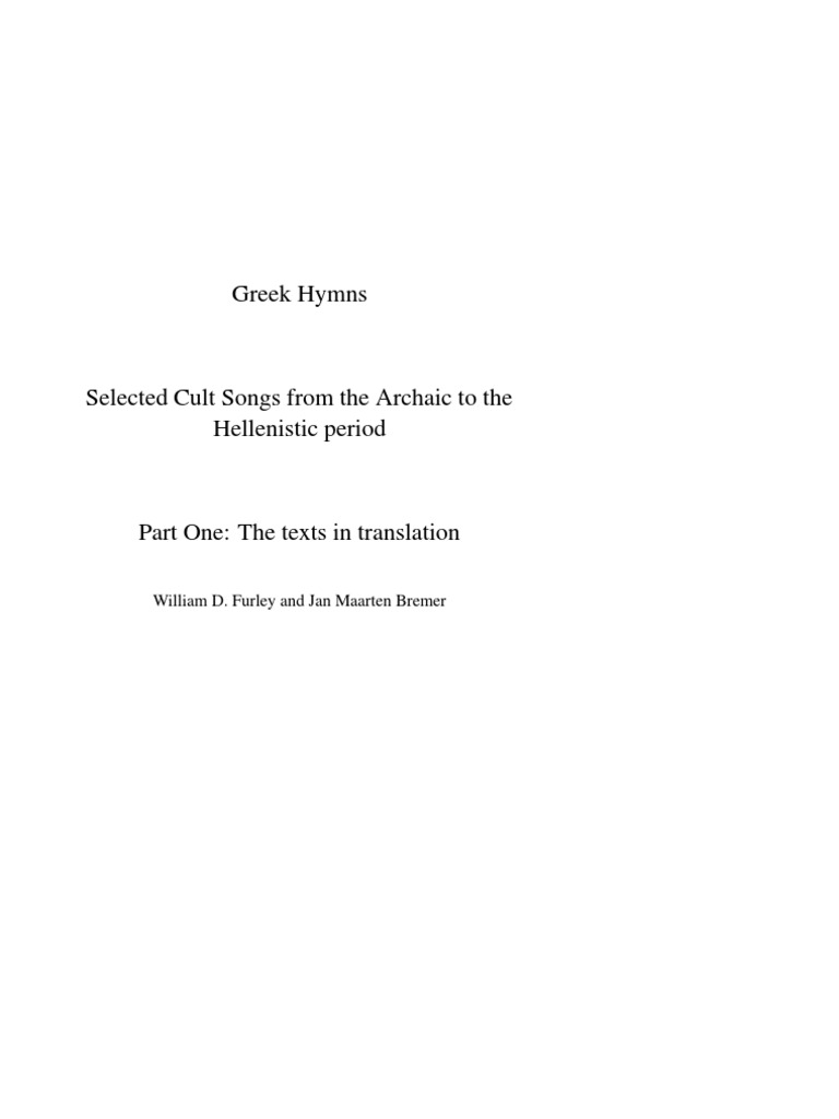 Greek text see Preisendanz et al. (1973-1974, vol. II, 237ff.); English translation: Betz (1986): studies: Riesenfeld (1946); Szepes (1976); P. Poccetti in Cassio & Cerri (1991, ch. 7); C.A. Faraone, A hymn to Selene-Hecate-Artemis from a Greek magical handbook (PGM IV 2714-83) in Kiley (1997, 195-99). 141 See W. Fauth, Helios Megistos. Zur synkretischen Theologie der Sp tantike, Leiden a 1995, 41-55; Furley (1995a, 39f.); Graf in Faraone & Obbink (1991, 188-213). 142 And the iambic poem from Kyrene, see Peek (1930, 129ff.); for Egyptian hymns to Isis in Greek written in hexameters or elegiac couplets see Bernand (1969, 631-652); an epigraphic hymn in elegiacs to Anubis: R. Merkelbach & J. Stauber, Steinepigramme aus