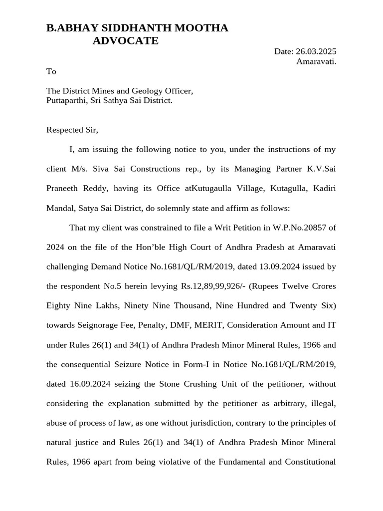 M/s.Siva Sai Constructions, my client will be constrained to invoke the