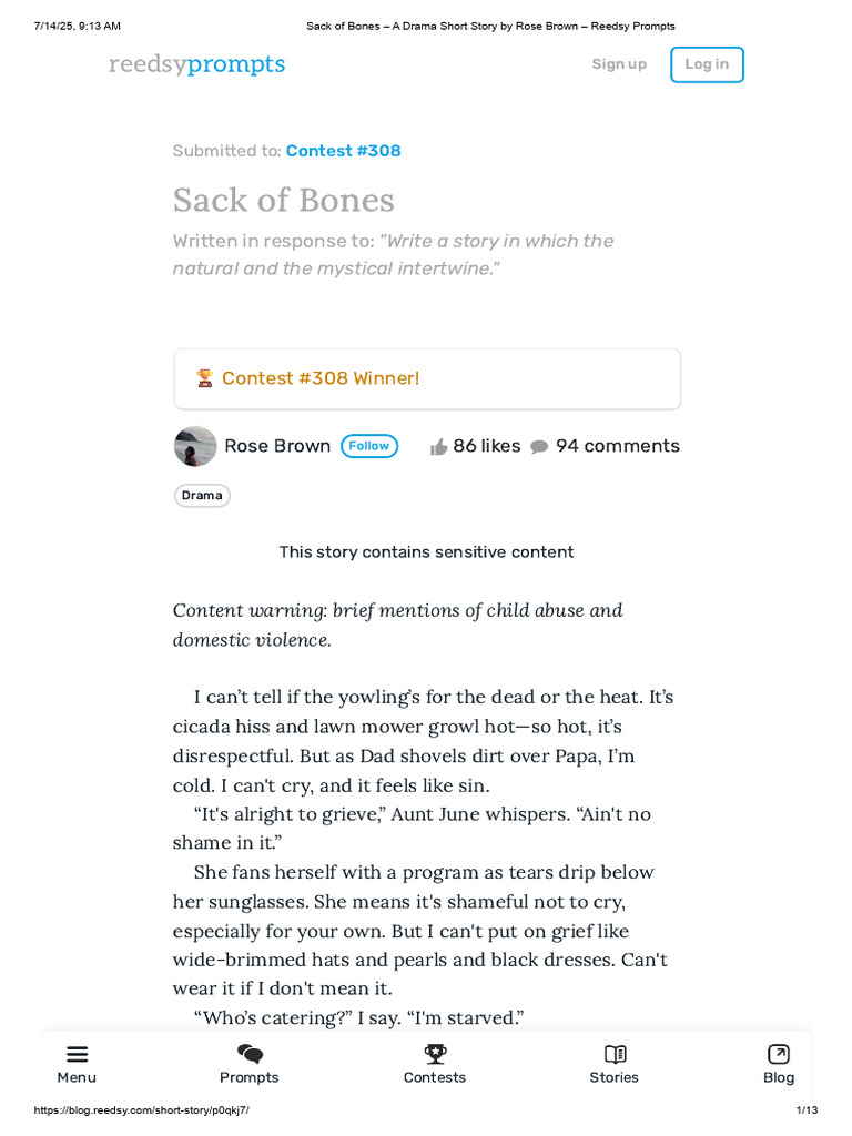 7/14/25, 9:13 AM Sack of Bones – A Drama Short Story by Rose Brown – Reedsy Prompts