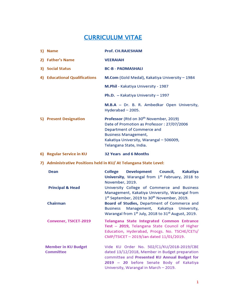 7) Administrative Positions held in KU/ At Telangana State Level: