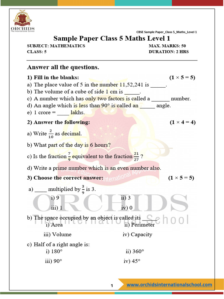 Sample Paper Class 5 Maths Level 1