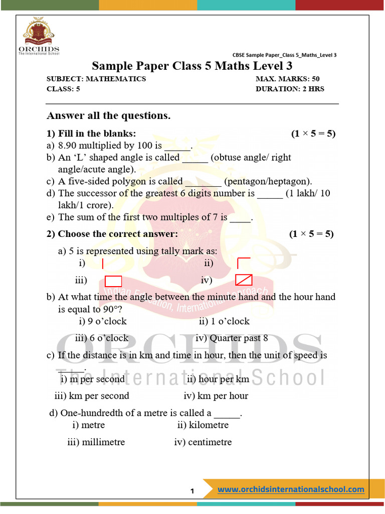 Sample Paper Class 5 Maths Level 3
