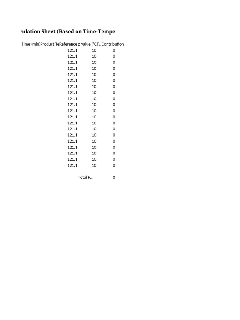 The document presents a value calculation sheet based on time-temperature data for a product at a constant temperature of 121.1°C. All entries indicate a reference z-value of 10 and contribute a total F₀ value of 0. This suggests that the processing conditions do not lead to any thermal lethality effect in the given time frame.