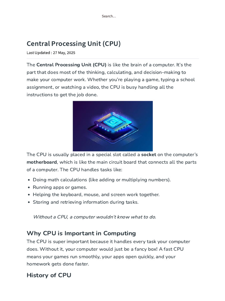 The Central Processing Unit (CPU) is like the brain of a computer. It’s the part that does most of the