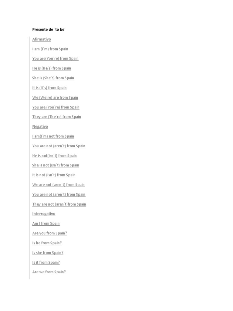 from Spain It is (Its) from Spain We (Were) are from Spain You are (Youre) from Spain They are (There) from Spain Negativo I am(Im) not from Spain You are not (arent) from Spain He is not(isnt) from Spain She is not (isnt) from Spain It is not (isnt) from Spain We are not (arent) from Spain You are not (arent) from Spain They are not (arent)from Spain Interrogativo Am I from Spain Are you from Spain? Is he from Spain? Is she from Spain? Is it from Spain? Are we from Spain?
