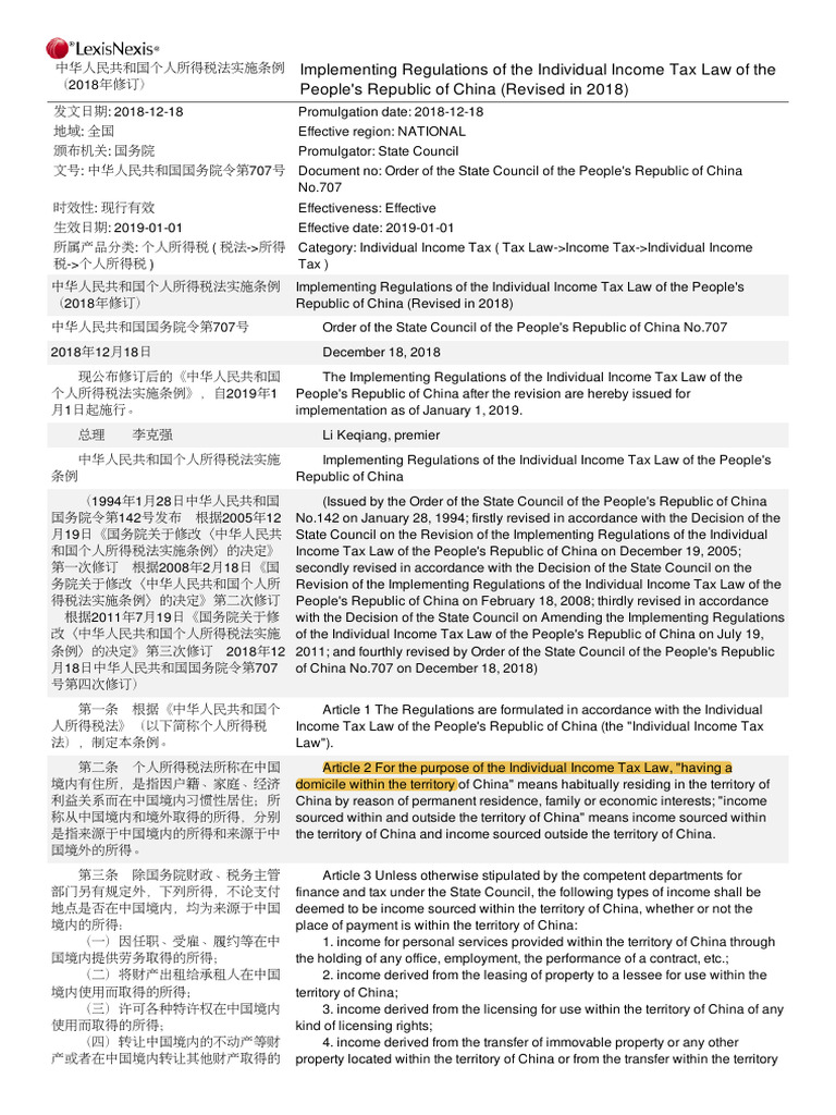 中华⼈民共和国个⼈所得税法实施条例 Implementing Regulations of the Individual Income Tax Law of the People's