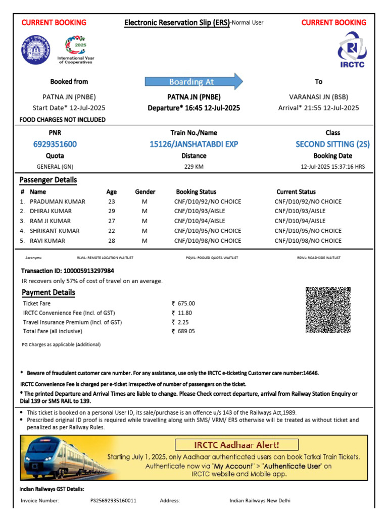 Invoice Number: PS25692935160011 Address: Indian Railways New Delhi
