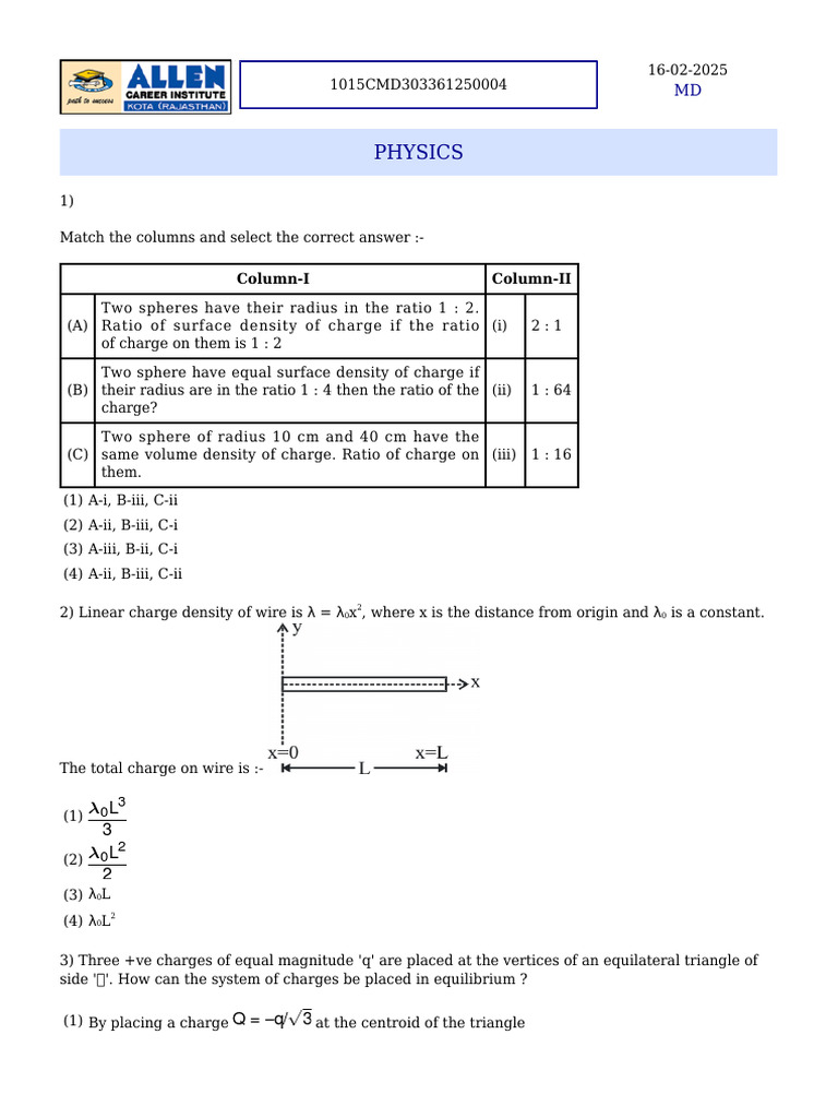 2) Linear charge density of wire is λ = λ0x2, where x is the distance from origin and λ0 is a constant.