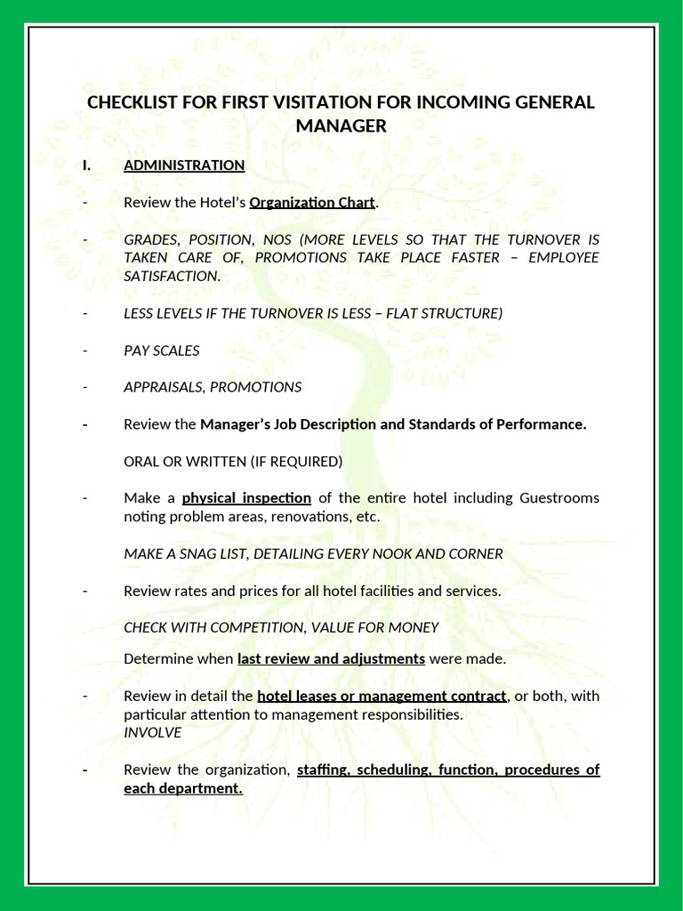 - Make a physical inspection of the entire hotel including Guestrooms