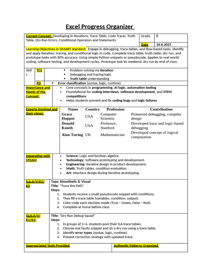 Current Concept: Developing in Iterations, Trace Table, Code Tracer, Truth Grade 8