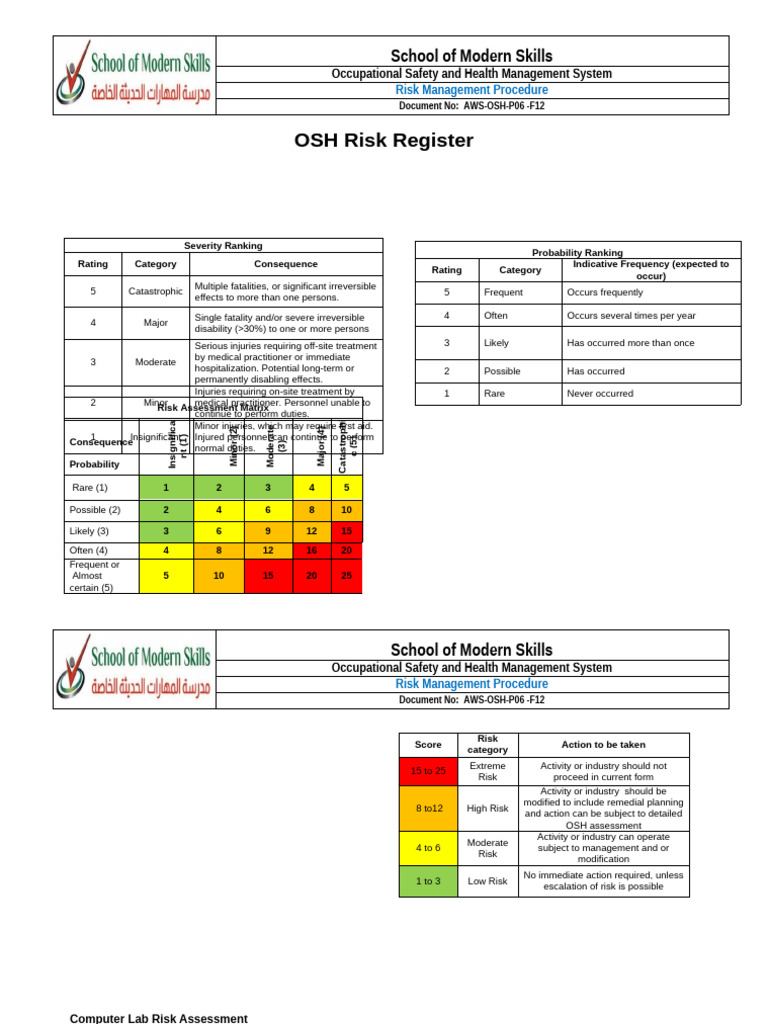 Computer Lab risk assessment can ensure that potential hazards and risks are identified, how and whom can be at risk, and the control measures