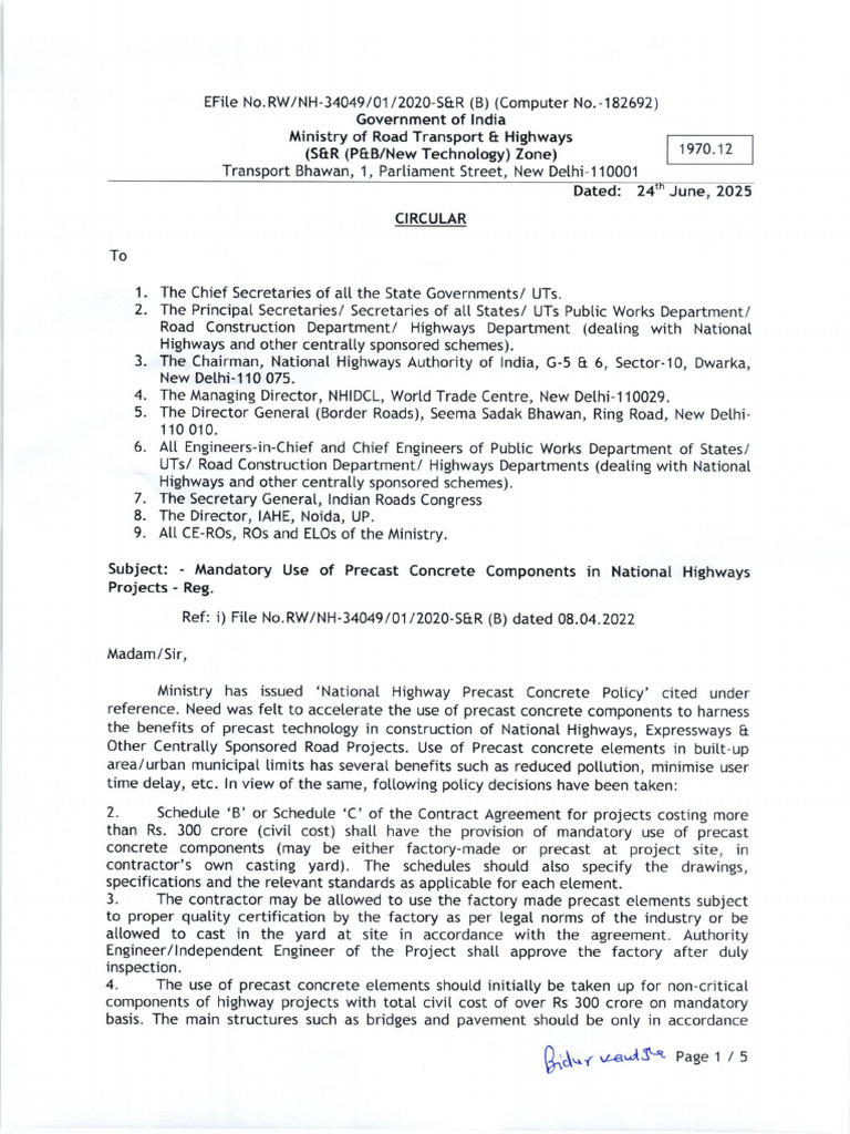 Subject: - Mandatory Use of Precast Concrete Components in Nationat Highways