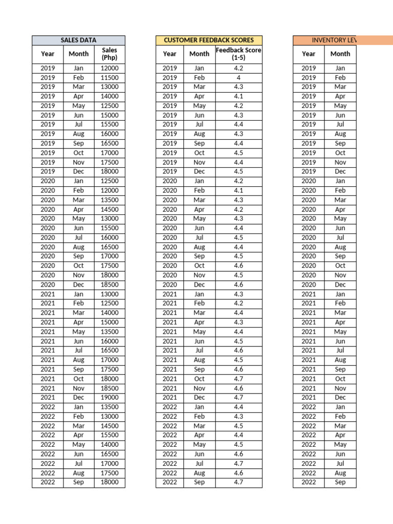 SALES DATA CUSTOMER FEEDBACK SCORES INVENTORY LEVEL UNITS