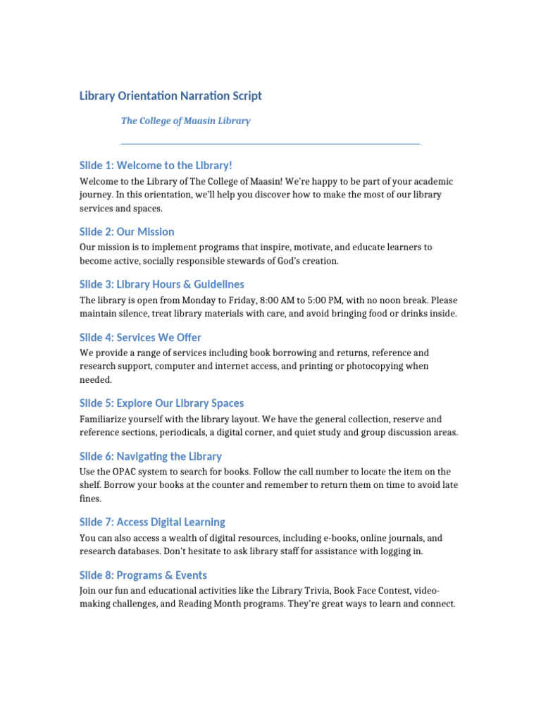 Thank you for joining this orientation. The College of Maasin Library is your gateway to