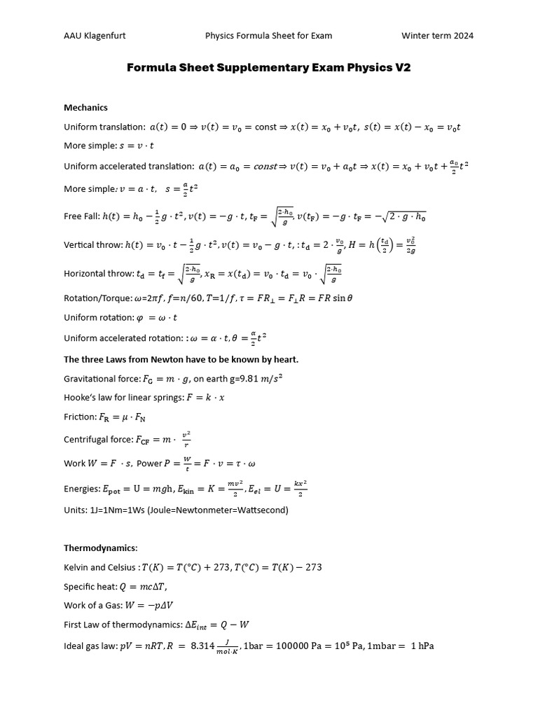 AAU Klagenfurt Physics Formula Sheet for Exam Winter term 2024