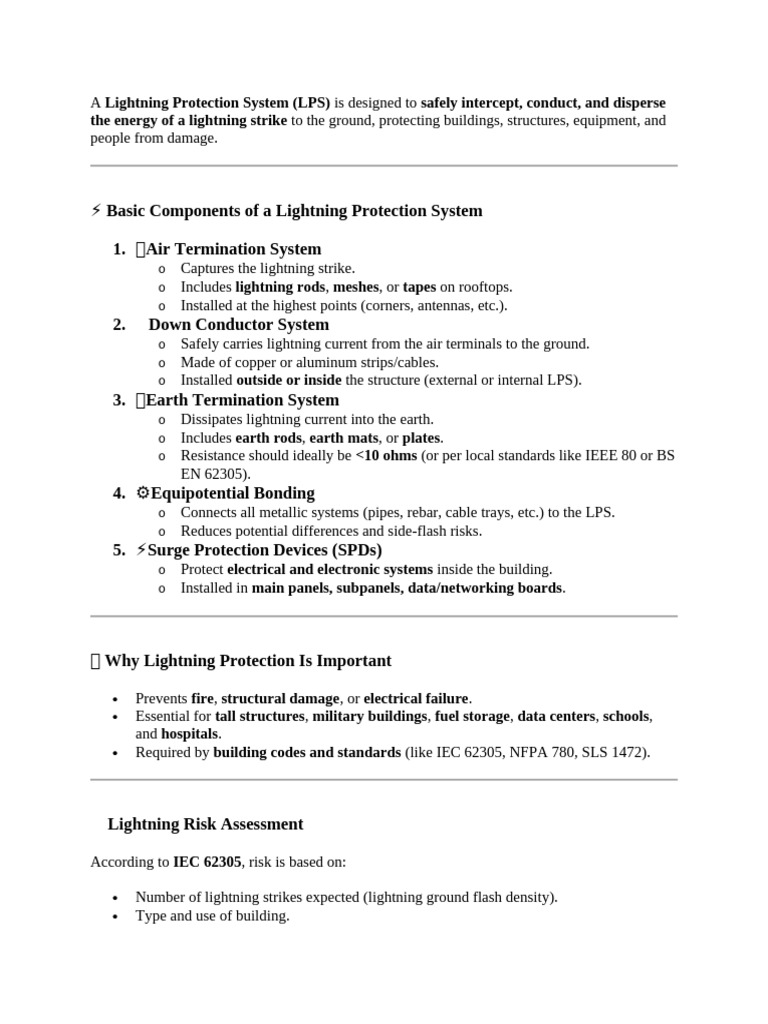 A Lightning Protection System (LPS) is designed to safely intercept, conduct, and disperse
