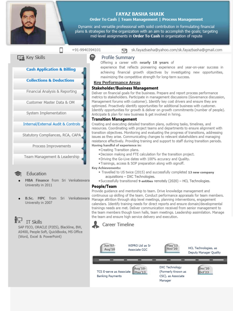 ● MBA Finance from Sri Venkateswara • Successfully transitioned 9 entities remotely (2020) – HCL Technologies.