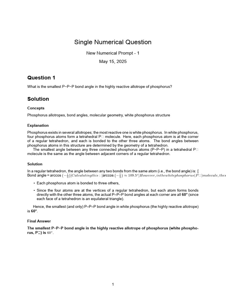Bond angle = arccos − 13 ]Calculatingthis : [arccos − 13 ≈ 109.5◦ ]However, inthewhitephosphorus(P �)molecule, thes