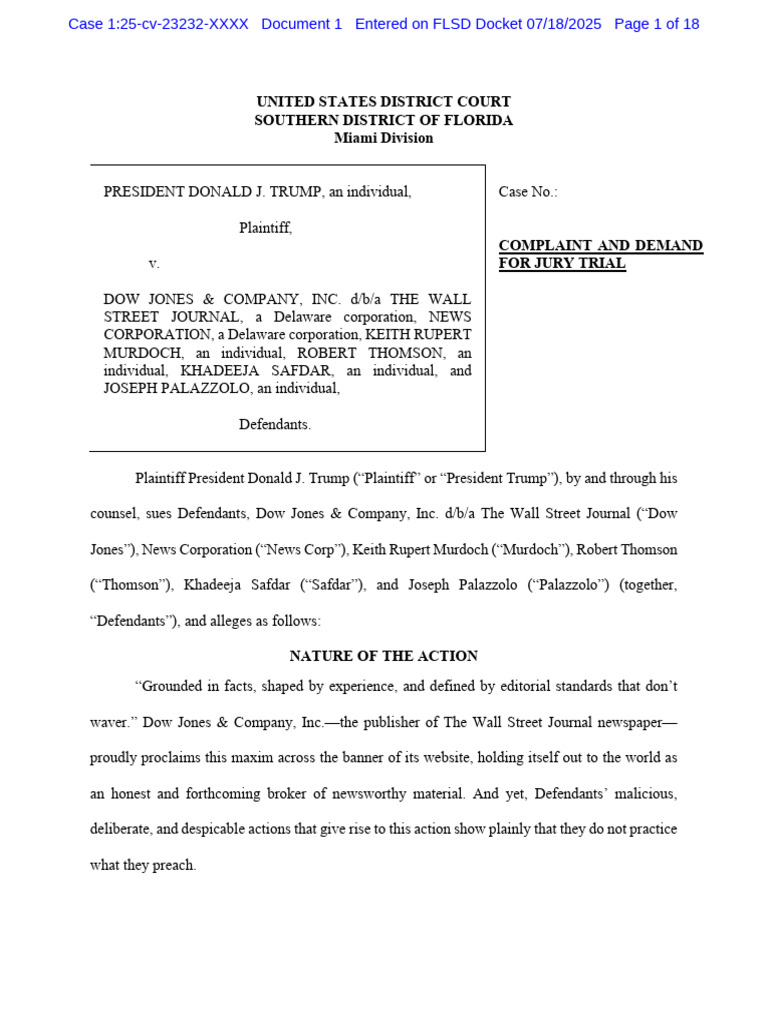 counsel, sues Defendants, Dow Jones & Company, Inc. d/b/a The Wall Street Journal (“Dow