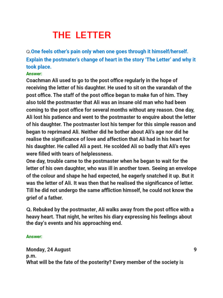 Explain the postmater’s change of heart in the story ‘The Letter’ and why it